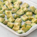 Prepare baking sheet.Line a baking sheet with a silicone mat or parchment paper. Wash and dry the avocados.Rinse the avocados under cool running water. Gently rub the skin to remove any debris or residue. Dry with a clean towel. Cut the avocados in half, lengthwise.Move your knife top to bottom, slicing straight down along the pit. Pull apart the two halves and remove the pit. Peel and cut into cubes or wedges.You can also scoop the flesh out of the skin, then cut. Put the avocados in the freezer for 1-2 hours.Place the avocados on the baking sheet in a single layer. Make sure the avocado pieces are separate from each other. Transfer the baking sheet to the freezer. Freeze for 1 to 2 hours, or until the avocados are frozen. Put frozen avocados into a freezer-safe bag and store in the freezer.Push out the excess air and press the seal to close. Use frozen avocados in 3-6 months for the best texture.